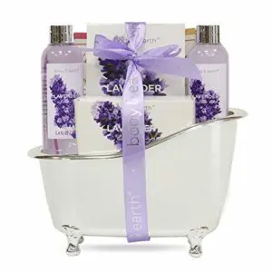 Das Badegeschenkset für Frauen enthält Duschgel, Schaumbad, Badeseife und Badesalz mit Lavendelduft, verpackt in einer Plastikbadewanne. Die Produkte pflegen die Haut und haben eine entspannende Wirkung.