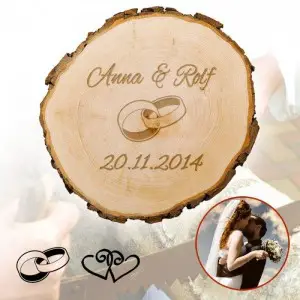 Die Baumscheibe zur Hochzeit wird mit einer persönlichen Gravur des Hochzeitspärchens versehen. Eine Anlehnung an die schöne Tradition des Baumstamm-Durchsägens.