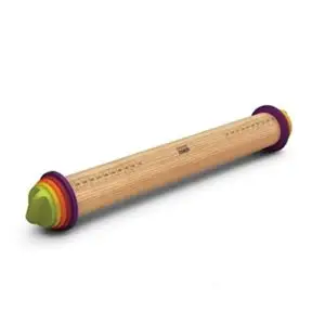 Das einstellbare Nudelholz besteht aus einer Holzrolle mit Messskala und Abstandsscheiben für 2, 4, 6 oder 10 Millimeter dicken Teig. So kann der Teig in gleichmäßiger Dicke ausgerollt werden.