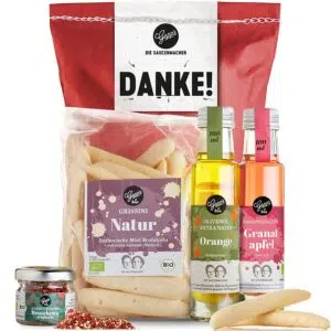 Der Geschenkkorb zum Danke sagen enthält hochwertige Feinkost mit besonderen Ölen und Bruschetta.