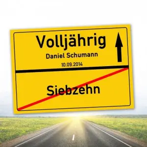 Das persönliches Ortsschild mit eigenem Namensaufdruck ist die passende Geschenkidee zum Führerschein. Gestern noch Siebzehn ... heute schon volljährig. Ein Geschenk mit hohem Gagfaktor.