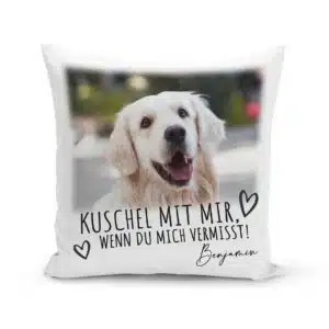 Das Kissen für Hundebesitzer ist mit Bildern des geliebten Vierbeiners bedruckt. Es ist für alle Personen, die Hunde besitzen, ein individuelles und exklusives Geschenk, das viel Freude bereitet.
