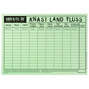Das Knast Land Fluss Spiel ist eine Kriminal-Version des beliebten Schreib- und Denkspiels Stadt Land Fluss. Das Spielprinzip ist gleich, die Oberbegriffe kommen aus dem Gangstermilieu. Achtung: Lachattacken sind vorprogrammiert.