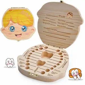 Die Milchzahndose aus Holz ist mit vielen Details gestaltet. Jeder ausgefallene Milchzahn hat seinen eigenen Platz. Im Deckel können persönliche Notizen gemacht werden. Das kann der Name des Kindes sein.