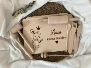 Ein personalisierbares Kinderbackset enthält alles was du für einen Backnachmittag mit deinem Kind brauchst. Kleine Backfans werden Mama mit ihren ersten eigenen Backwerkzeugen sicher gerne in der Küche helfen.