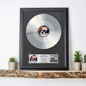 Die silberne Schallplatte zur Hochzeit ist ein Farbdruck in einem edlen Holzrahmen. Das Bild ist personalisierbar mit einem Foto des Hochzeitspaares, den Namen und dem Hochzeitstag.